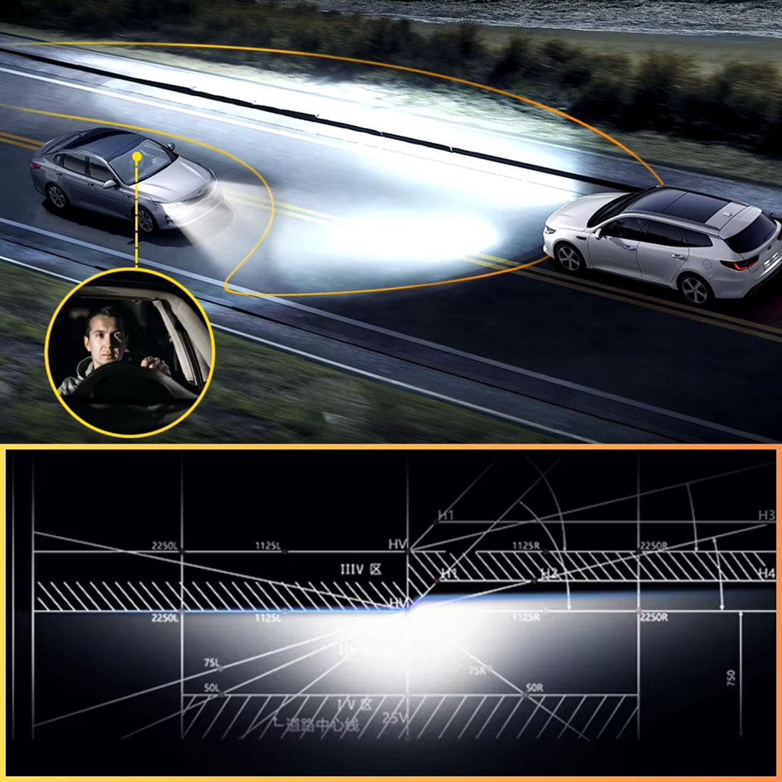 ⭐Potężna Moc Światła – 48,000 lumen (na parę), każda nocna podróż staje się wyjątkowo bezpieczna i komfortowa. Maksymalna widoczność na drodze, niezależnie od warunków pogodowych.