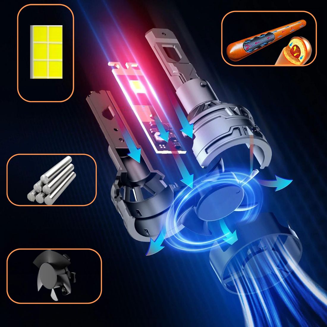 ✅Cichy Silnik i Wentylator z Łożyskiem Kulowym: Dzięki inteligentnemu, cichemu silnikowi oraz wentylatorowi, żarówki działają płynnie i bez hałasu, co znacząco poprawia komfort jazdy.