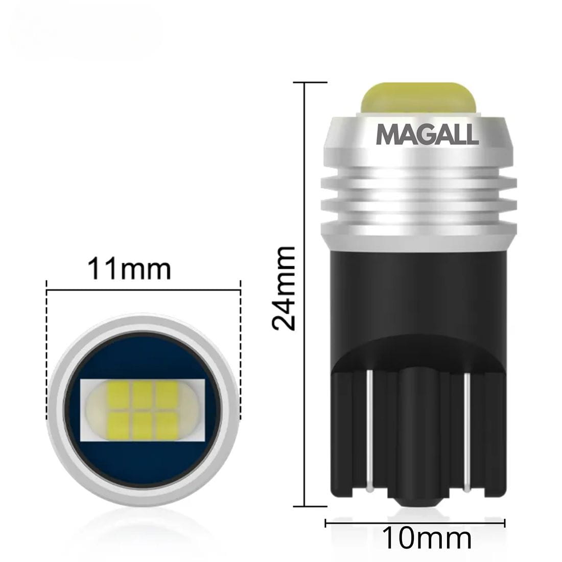 Żarówka LED W5W MAGALL ma identyczne wymiary jak klasyczna halogenowa żarówka W5W – długość 24 mm, szerokość 11 mm, średnica trzonka 10 mm.